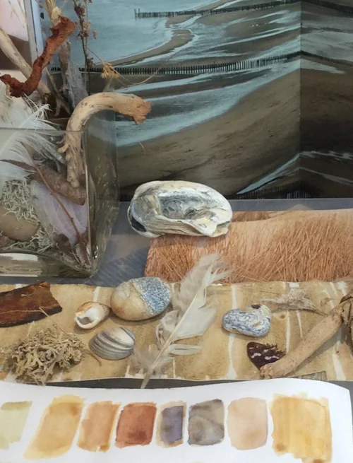 walking, observing, gathering earth material resources for experimental mark making, recording colour using watercolour paints & earth pigments on paper & cloth